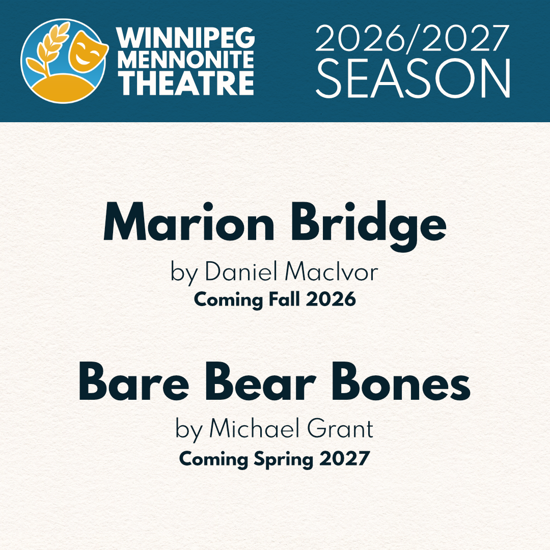 We’re looking forward to seeing you at our next two performances; Marion Bridge by Daniel MacIvor in Fall 2026 and Bare Bear Bones by Michael Grant in Spring 2027.